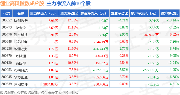 资金流向方面,创业高贝(399694)指数成份股当日主力资金净流出合计57.69亿元,游资资金净流入合计30.39亿元,散户资金净流入合计27.3亿元。成份股资金流向详情见下表: