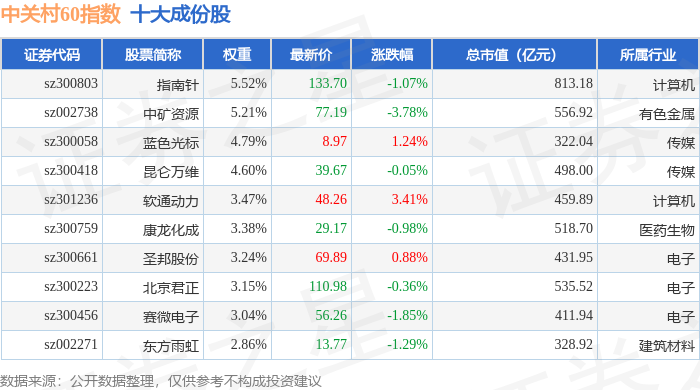 证券之星消息,12月29日,中关村60(399697)指数报收于3705.91点,跌0.37%,成交463.27亿元,换手率3.32%。当日该指数成份股中,上涨的有19家,三博脑科以7.21%的涨幅领涨,下跌的有39家,万集科技以5.11%的跌幅领跌。
