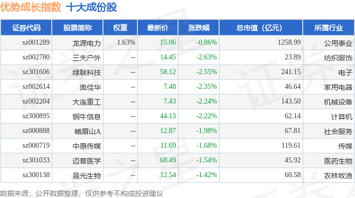 优势成长(399698)指数十大成份股详情如下: