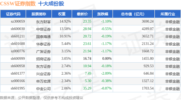 CSSW证券(399707)指数十大成份股详情如下: