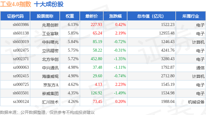 证券之星消息,12月29日,工业4.0(399803)指数报收于5334.17点,涨0.19%,成交963.08亿元,换手率2.25%。当日该指数成份股中,上涨的有43家,步科股份以20.0%的涨幅领涨,下跌的有36家,创世纪以7.55%的跌幅领跌。