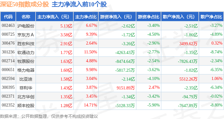 资金流向方面,深证50(399850)指数成份股当日主力资金净流出合计63.35亿元,游资资金净流入合计31.61亿元,散户资金净流入合计31.74亿元。成份股资金流向详情见下表: