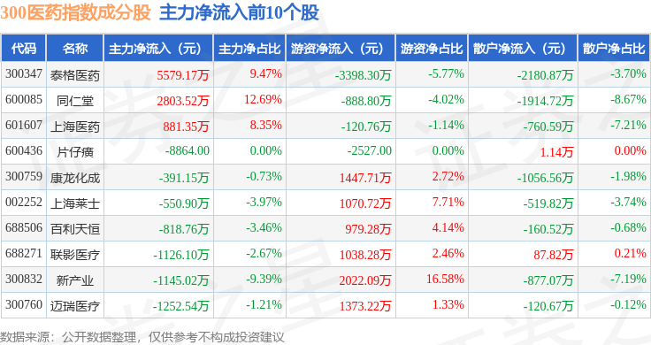 资金流向方面,300医药(399913)指数成份股当日主力资金净流出合计9.81亿元,游资资金净流入合计5.62亿元,散户资金净流入合计4.19亿元。成份股资金流向详情见下表: