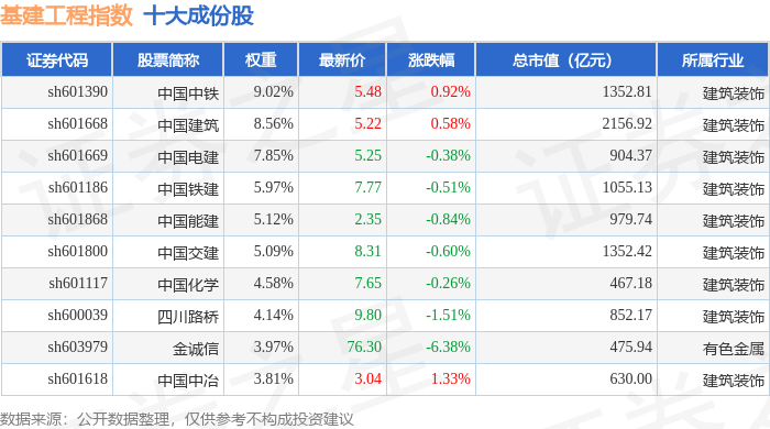 证券之星消息,12月29日,基建工程(399995)指数报收于3936.88点,跌0.3%,成交232.7亿元,换手率1.09%。当日该指数成份股中,上涨的有22家,杭萧钢构以10.04%的涨幅领涨,下跌的有27家,中铝国际以7.17%的跌幅领跌。
