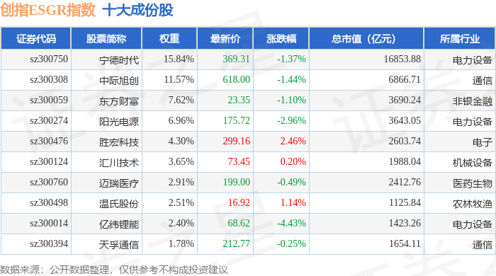 证券之星消息,12月29日,创指ESGR(470028)指数报收于3669.91点,跌0.62%,成交1568.79亿元,换手率2.55%。当日该指数成份股中,上涨的有27家,迈为股份以20.0%的涨幅领涨,下跌的有52家,欣旺达以11.39%的跌幅领跌。