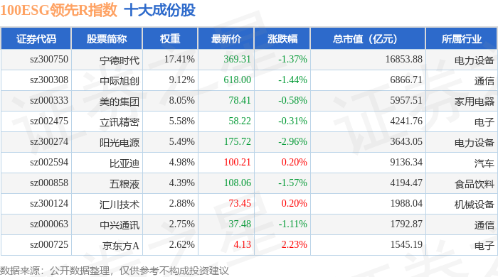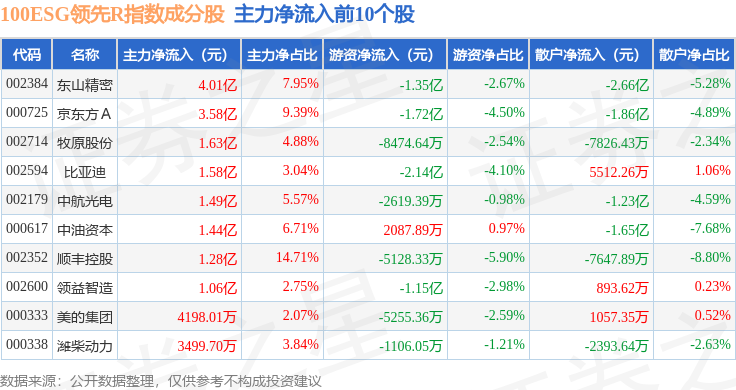 资金流向方面,100ESG领先R(470030)指数成份股当日主力资金净流出合计73.63亿元,游资资金净流入合计30.01亿元,散户资金净流入合计43.63亿元。成份股资金流向详情见下表: