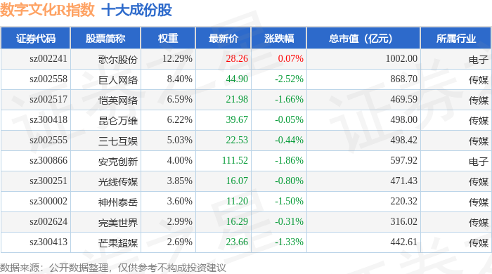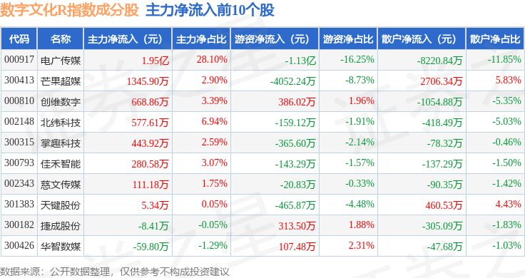 资金流向方面,数字文化R(470047)指数成份股当日主力资金净流出合计12.72亿元,游资资金净流入合计1.91亿元,散户资金净流入合计10.81亿元。成份股资金流向详情见下表:
