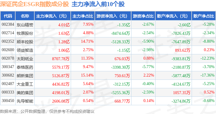 资金流向方面,深证民企ESGR(470056)指数成份股当日主力资金净流出合计55.27亿元,游资资金净流入合计13.7亿元,散户资金净流入合计41.57亿元。成份股资金流向详情见下表: