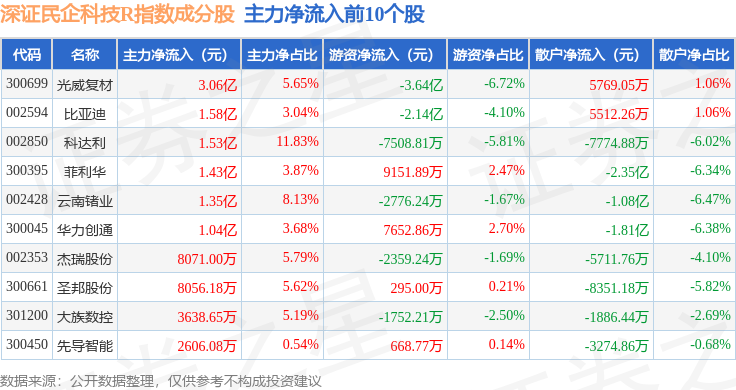 资金流向方面,深证民企科技R(470059)指数成份股当日主力资金净流出合计43.92亿元,游资资金净流入合计7.84亿元,散户资金净流入合计36.08亿元。成份股资金流向详情见下表: