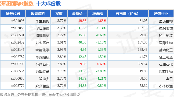 证券之星消息,12月29日,深证回购R(470063)指数报收于3276.4点,跌1.08%,成交455.7亿元,换手率2.16%。当日该指数成份股中,上涨的有15家,金风科技以10.01%的涨幅领涨,下跌的有32家,华联控股以9.99%的跌幅领跌。