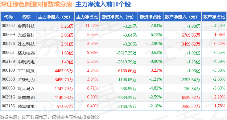 资金流向方面,深证绿色制造R(470069)指数成份股当日主力资金净流出合计66.32亿元,游资资金净流入合计9.1亿元,散户资金净流入合计57.22亿元。成份股资金流向详情见下表: