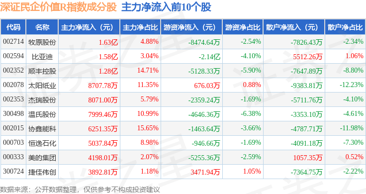 资金流向方面,深证民企价值R(470072)指数成份股当日主力资金净流出合计8.25亿元,游资资金净流出合计1.87亿元,散户资金净流入合计10.12亿元。成份股资金流向详情见下表: