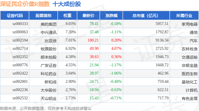 证券之星消息,12月29日,深证民企价值R(470072)指数报收于4761.74点,跌0.26%,成交422.19亿元,换手率1.3%。当日该指数成份股中,上涨的有15家,牧原股份以4.07%的涨幅领涨,下跌的有34家,大中矿业以7.36%的跌幅领跌。