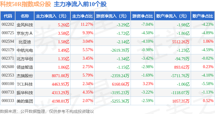 资金流向方面,科技50R(470080)指数成份股当日主力资金净流出合计43.71亿元,游资资金净流入合计6.1亿元,散户资金净流入合计37.6亿元。成份股资金流向详情见下表: