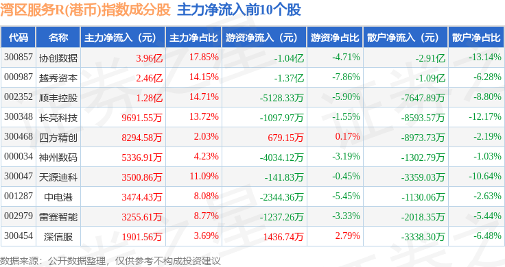 资金流向方面,湾区服务R(港币)(480012)指数成份股当日主力资金净流入合计2.92亿元,游资资金净流入合计664.57万元,散户资金净流出合计2.98亿元。成份股资金流向详情见下表: