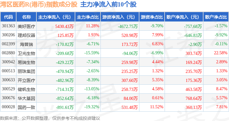 资金流向方面,湾区医药R(港币)(480014)指数成份股当日主力资金净流出合计3.62亿元,游资资金净流入合计6535.06万元,散户资金净流入合计2.97亿元。成份股资金流向详情见下表: