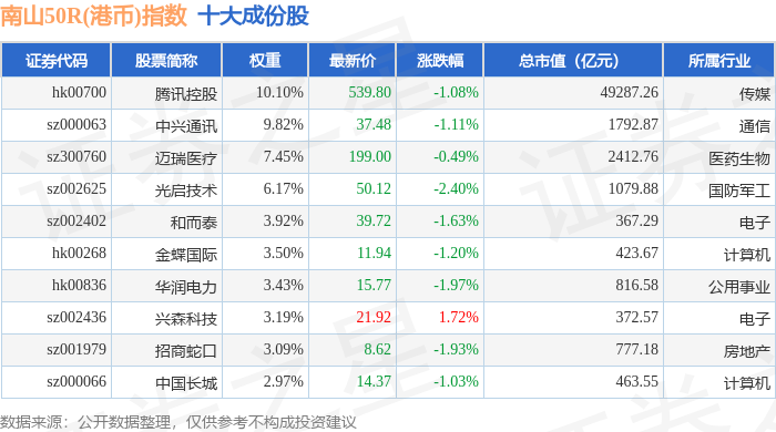 南山50R(港币)(480024)指数十大成份股详情如下: