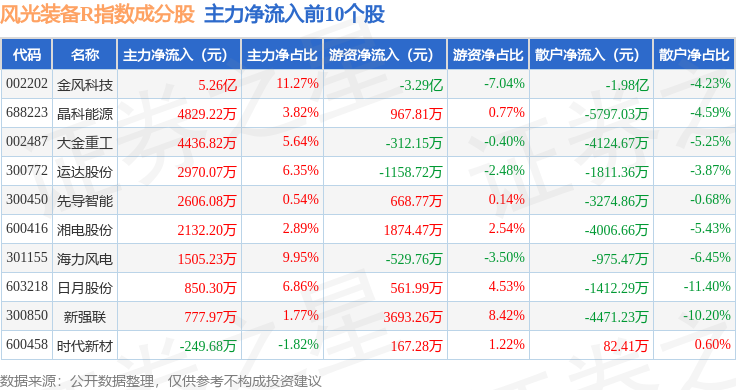 资金流向方面,风光装备R(480026)指数成份股当日主力资金净流出合计28.26亿元,游资资金净流入合计7.78亿元,散户资金净流入合计20.48亿元。成份股资金流向详情见下表: