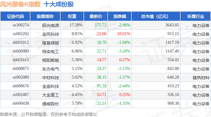 风光装备R(480026)指数十大成份股详情如下: