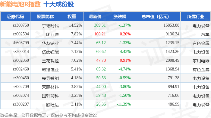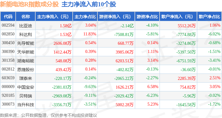 资金流向方面,新能电池R(480032)指数成份股当日主力资金净流出合计57.8亿元,游资资金净流入合计12.64亿元,散户资金净流入合计44.65亿元。成份股资金流向详情见下表: