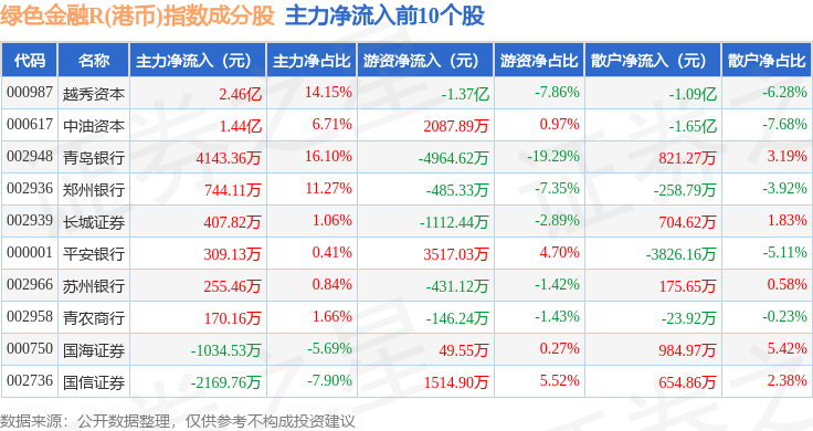 资金流向方面,绿色金融R(港币)(480053)指数成份股当日主力资金净流出合计6.13亿元,游资资金净流入合计2.47亿元,散户资金净流入合计3.66亿元。成份股资金流向详情见下表: