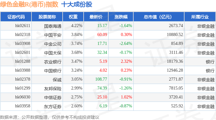 绿色金融R(港币)(480053)指数十大成份股详情如下: