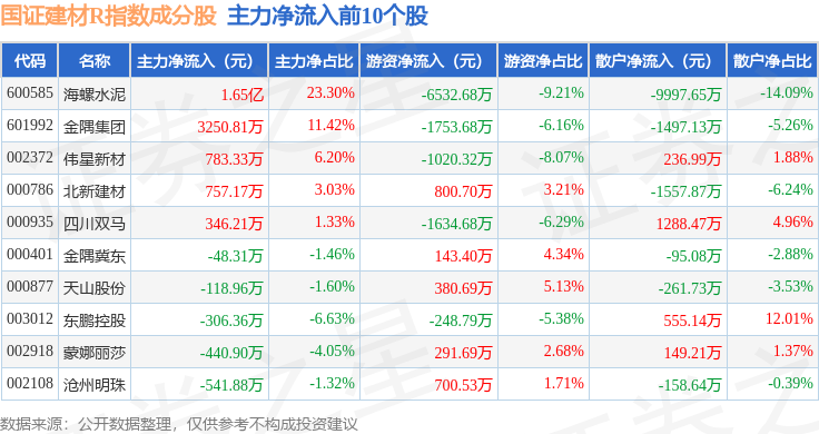 资金流向方面,国证建材R(480048)指数成份股当日主力资金净流出合计5.82亿元,游资资金净流入合计9070.72万元,散户资金净流入合计4.91亿元。成份股资金流向详情见下表: