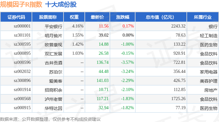 证券之星消息,12月29日,规模因子R(480055)指数报收于2335.59点,跌0.57%,成交196.95亿元,换手率0.81%。当日该指数成份股中,上涨的有11家,双林股份以3.17%的涨幅领涨,下跌的有37家,古井贡酒以3.57%的跌幅领跌。