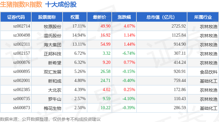 生猪指数R(480073)指数十大成份股详情如下: