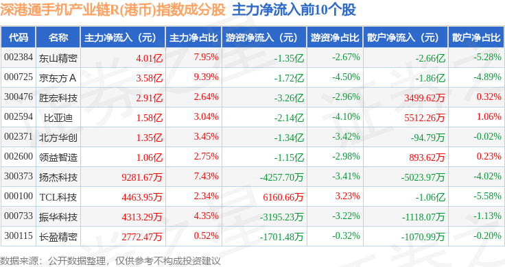 资金流向方面,深港通手机产业链R(港币)(483010)指数成份股当日主力资金净流出合计12.14亿元,游资资金净流出合计5.98亿元,散户资金净流入合计18.12亿元。成份股资金流向详情见下表: