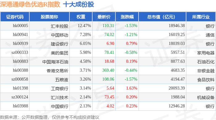 深港通绿色优选R(483011)指数十大成份股详情如下: