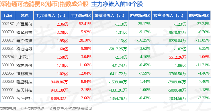 资金流向方面,深港通可选消费R(港币)(483020)指数成份股当日主力资金净流出合计28.03亿元,游资资金净流出合计8.83亿元,散户资金净流入合计36.86亿元。成份股资金流向详情见下表: