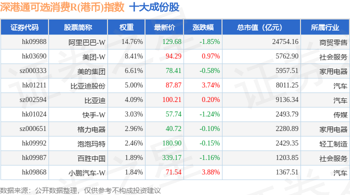 深港通可选消费R(港币)(483020)指数十大成份股详情如下: