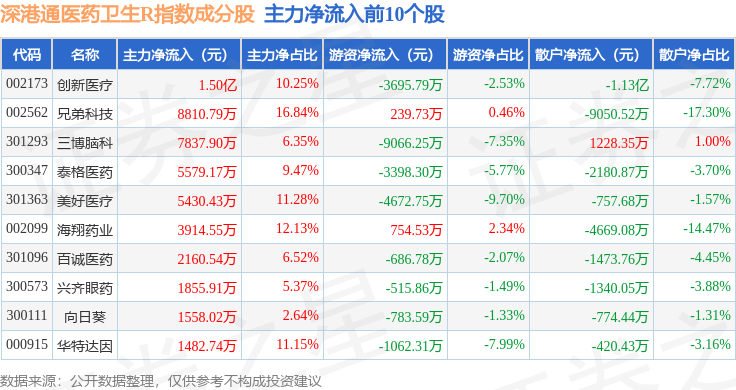 资金流向方面,深港通医药卫生R(483023)指数成份股当日主力资金净流出合计25.54亿元,游资资金净流入合计6.47亿元,散户资金净流入合计19.07亿元。成份股资金流向详情见下表: