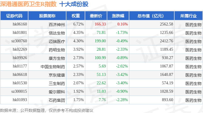 深港通医药卫生R(483023)指数十大成份股详情如下: