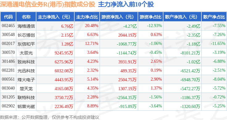资金流向方面,深港通电信业务R(港币)(483030)指数成份股当日主力资金净流出合计52.2亿元,游资资金净流入合计27.11亿元,散户资金净流入合计25.1亿元。成份股资金流向详情见下表: