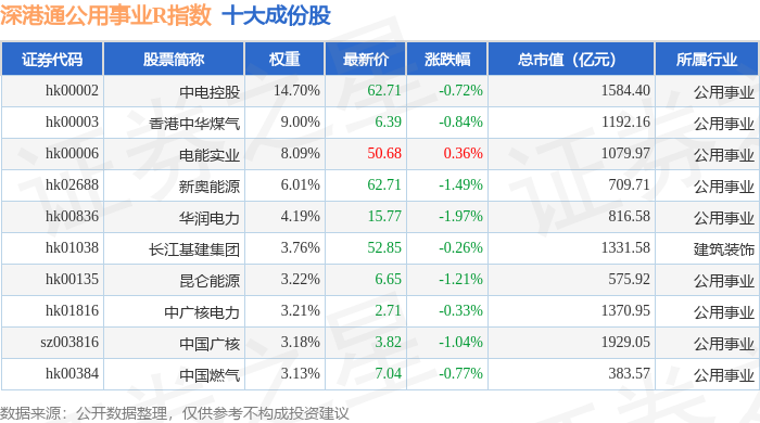 深港通公用事业R(483031)指数十大成份股详情如下: