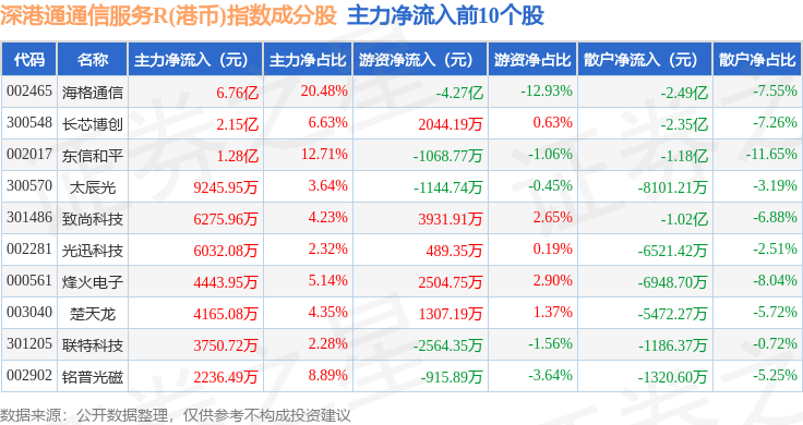 资金流向方面,深港通通信服务R(港币)(483034)指数成份股当日主力资金净流出合计49.85亿元,游资资金净流入合计26.06亿元,散户资金净流入合计23.79亿元。成份股资金流向详情见下表: