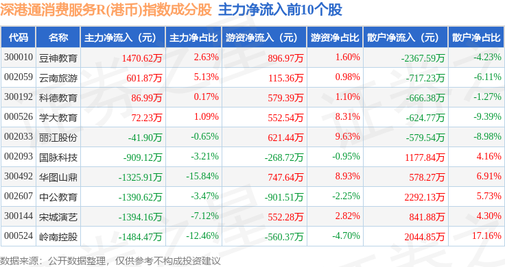 资金流向方面,深港通消费服务R(港币)(483046)指数成份股当日主力资金净流出合计3.01亿元,游资资金净流入合计1918.89万元,散户资金净流入合计2.82亿元。成份股资金流向详情见下表: