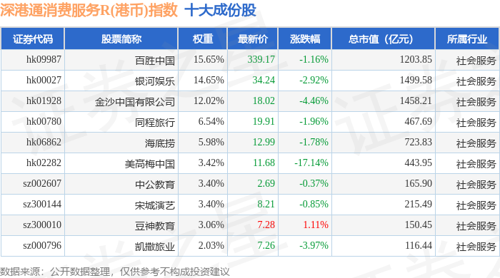 深港通消费服务R(港币)(483046)指数十大成份股详情如下: