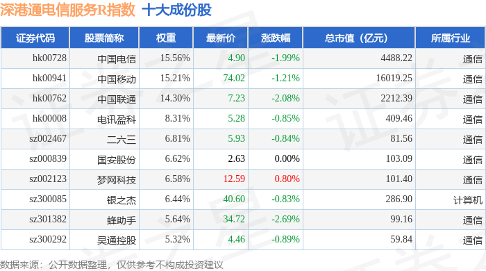 深港通电信服务R(483057)指数十大成份股详情如下:
