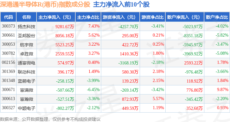 资金流向方面,深港通半导体R(港币)(483068)指数成份股当日主力资金净流出合计19.98亿元,游资资金净流入合计4.67亿元,散户资金净流入合计15.32亿元。成份股资金流向详情见下表: