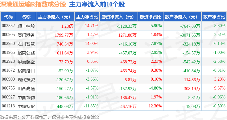 资金流向方面,深港通运输R(483077)指数成份股当日主力资金净流出合计2.97亿元,游资资金净流入合计5073.63万元,散户资金净流入合计2.46亿元。成份股资金流向详情见下表: