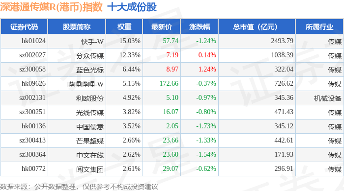 深港通传媒R(港币)(483076)指数十大成份股详情如下:
