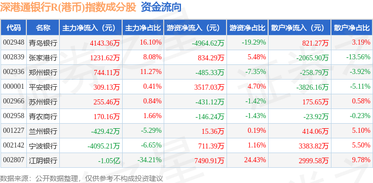 资金流向方面,深港通银行R(港币)(483082)指数成份股当日主力资金净流出合计8161.28万元,游资资金净流入合计6541.67万元,散户资金净流入合计1619.61万元。成份股资金流向详情见下表: