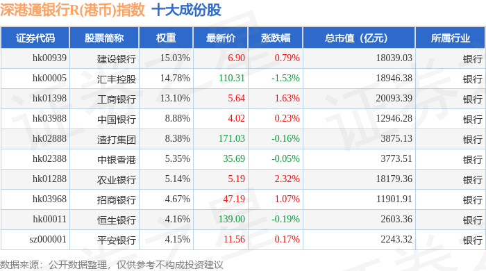 深港通银行R(港币)(483082)指数十大成份股详情如下: