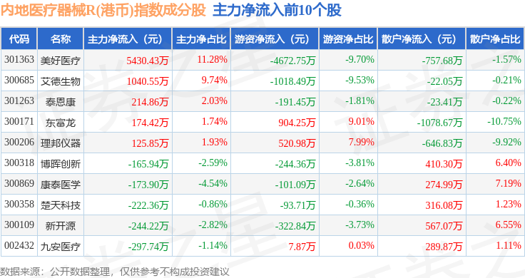 资金流向方面,内地医疗器械R(港币)(483104)指数成份股当日主力资金净流出合计3.77亿元,游资资金净流入合计9524.44万元,散户资金净流入合计2.81亿元。成份股资金流向详情见下表: