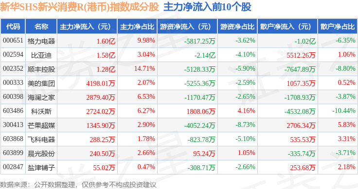 资金流向方面,新华SHS新兴消费R(港币)(489007)指数成份股当日主力资金净流出合计8733.27万元,游资资金净流出合计1.25亿元,散户资金净流入合计2.12亿元。成份股资金流向详情见下表: