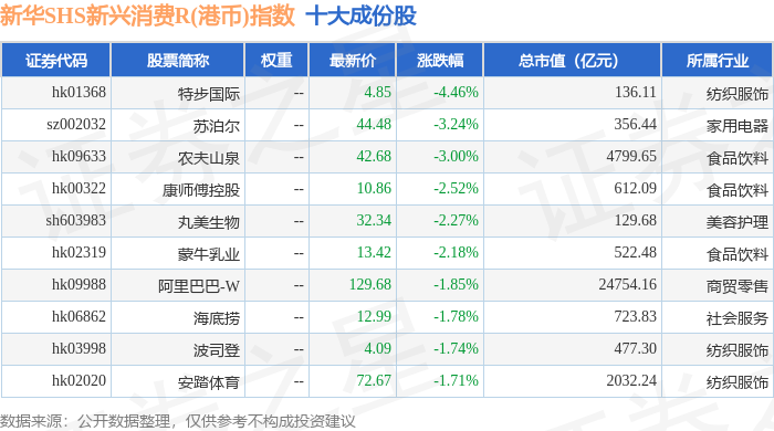 新华SHS新兴消费R(港币)(489007)指数十大成份股详情如下: