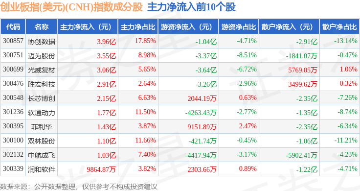 资金流向方面,创业板指(美元)(CNH)(970007)指数成份股当日主力资金净流出合计81.55亿元,游资资金净流入合计35.23亿元,散户资金净流入合计46.33亿元。成份股资金流向详情见下表: